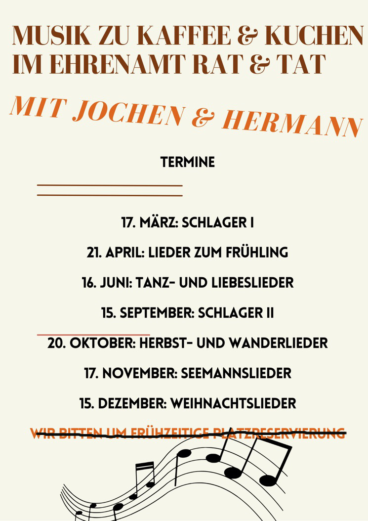 Livemusik zum Mitsingen bei Kaffee und Kuchen gibt es an jedem 3. Sonntag im Monat von 14-17 Uhr. Kaffee und Kuchen gibt es ab 14 Uhr, die Musik startet gegen 15 Uhr. Für 5 € gibt es Musik, 1 Stück Torte und Kaffee satt...